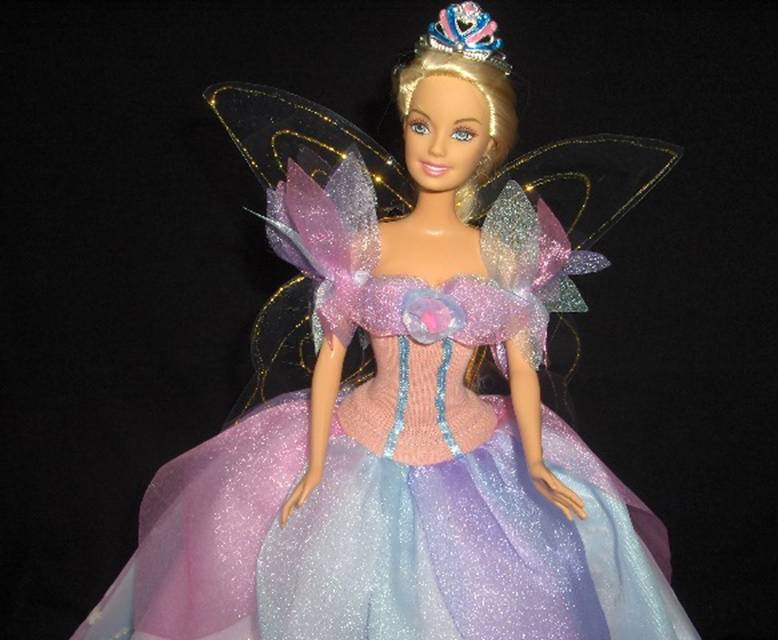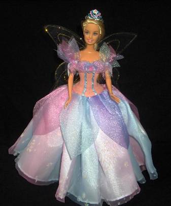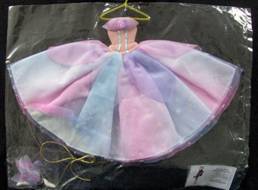 Le maniche sono staccate e rimovibili ,così come le ali a farfalla .E’ completato da una corona colorata on metallo e da scarpine bianche.