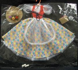 Abito composto da un pezzo unico inclusivo di corpetto camicia gonna e sottogonna bordato di pizzo e da un grembiale in tulle rifinito in pizzo allacciato sul retro e rimovibile.Il tutto è corredato da un cappello ed una borsina di tela juta guarniti con fiori di stoffa e da scarpine bianche |