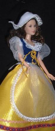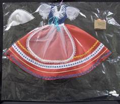 allacciato sul retro ,da una borsina di tela juta con fiori di stoffa e dal copricapoin panno e pizzo e dalle scarpine bianche