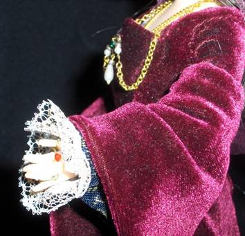 L’abito allacciato dietro,è evoluto rispetto al precedente . Il corsetto rigido, stringe il punto vita ,che scende a punta verso il basso.La scollatura è quadrata ,le maniche,della stessa stoffa del vestito ,si stringono all’attaccatura si allargano al gomito ad imbuto e mostrano le sottomaniche, ampie e ricche, con polsini di pizzo.La gonna, sostenuta da fusto per simulare il verdugale,comincia ad allargarsi sul fondo. Il copricapo a mezzaluna detto Touron è di stile francese e lascia i capelli liberi sotto un velo che scende sulle spalle.I gioielli tornano in evidenza insieme alle cinture a catena che scendono in basso. Le scarpe sono a becco d’oca e le calze sono fermate poco sopra il ginocchio da una giarrettiera. |