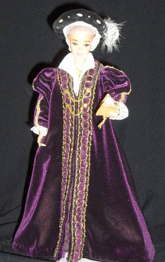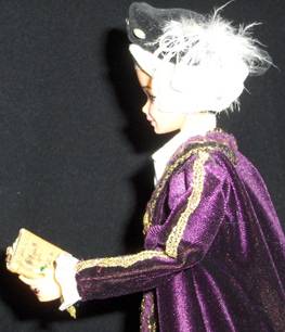 L’abito è costituito da una sopraveste allacciata davanti e che scende morbida ed ampia.L’apertura anteriore è sottolineata da una ricca passamaneria,ed è chiusa da catenelle decorazioni metalliche .Le maniche, molto ampie alla attaccatura e strette al polso, sono rifinite con un nastro d’oro,mentre i polsini sono di organza. La camicia di batista è aperta davanti e fermata da bottoncini a perlina. Il colletto,in piedi, si apre a V sul davanti. La sottogonna rigida, a campana e di dimensioni contenute è di un raso a fondo viola con disegni di fiori stilizzati.Il copricapo piumato è composto da una cuffia in batista che raccoglie i capelli e un berretto di velluto ricamato con perle.Anelli ,collane, calze e scarpe completano l’insieme. |