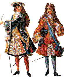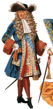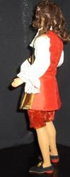 L’abito è composto dal cappello a tricorno rifinito con piume,la giacca arricchita da ricami dorati e tasche esterne , un gilet di raso dorato e seta rossa ,rifinito da bottoncini a diamante ,una cravatta di pizzo e la camicia di batista con ampie maniche e doppi polsini sempre di pizzi , brache al ginocchio e calze. La parrucca è stata autocostruita così come le scarpe ed i gioielli. |